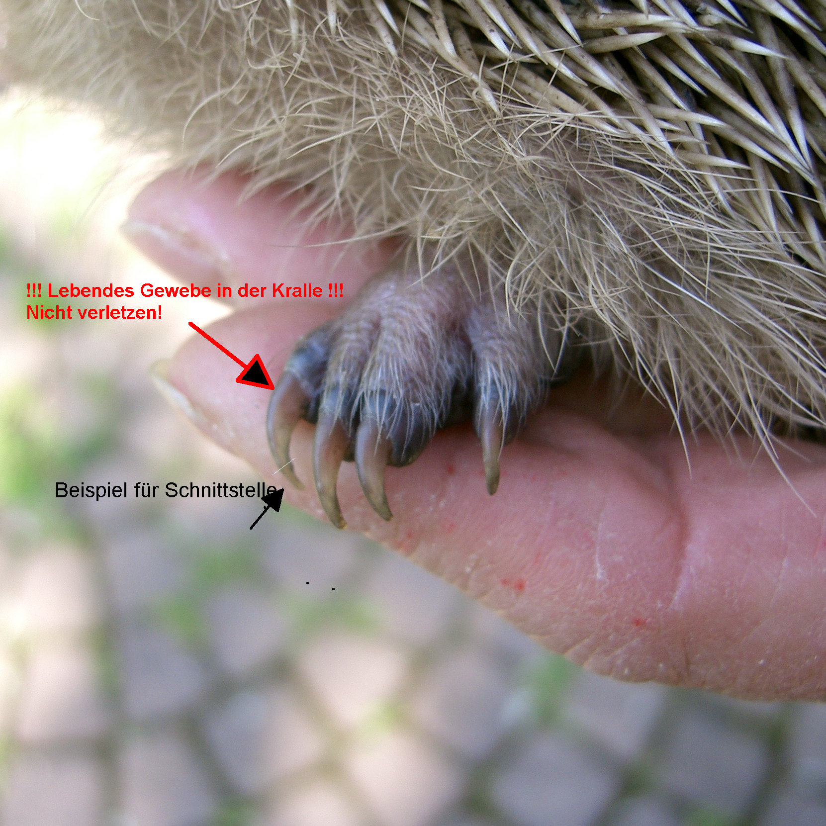 Richtige Krallenlänge: Krallen an Hinterpfoten meist deutlich länger als an Vorderpfoten. Krumme Krallen müssen geschnitten werden. Aber Achtung: Lebendes Gewebe reicht als Zapfen mehrere Millimeter in die Kralle. Auf diesem Foto ist lebendes Gewebe in der Kralle gut zu sehen.